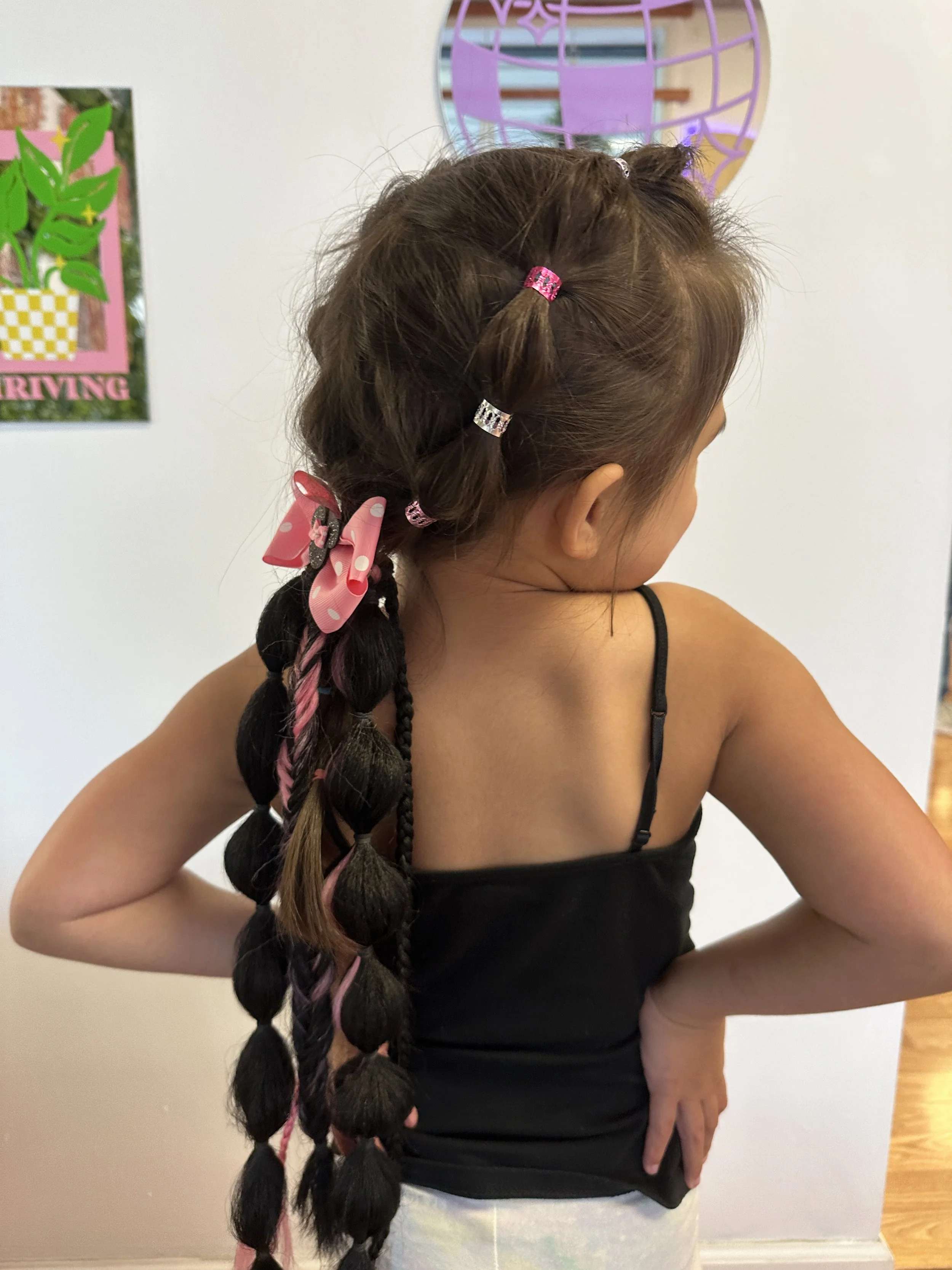 LJ Braid Bar features all different styles of braids with all the extras!! Hair glitter, gems, clips, anything you can dream up . The MVP of Braid Bar is our rainbow extensions, add them to your style or request one of our custom ponytail pieces.